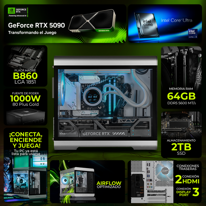 La DXT Ultra combina lo mejor de la nueva generación en una PC lista para el futuro. Con la potencia impulsada por IA de la NVIDIA RTX 5090, el procesador Intel Core Ultra 9 285K y la tarjeta madre B860M GAMING PLUS WIFI, disfruta de gráficos ultrarrealistas, FPS altísimos y multitarea sin límites para gaming y creación de contenido profesional.