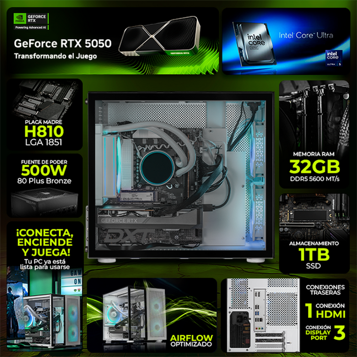La DXT Starter es perfecta para quienes buscan su primera PC gamer accesible y confiable. Con el procesador Intel Core Ultra 5 225F, la NVIDIA GeForce RTX 5050 y la tarjeta madre H810, tendrás rendimiento sólido en juegos como LoL, Roblox, Rocket League y Minecraft en 1080p.